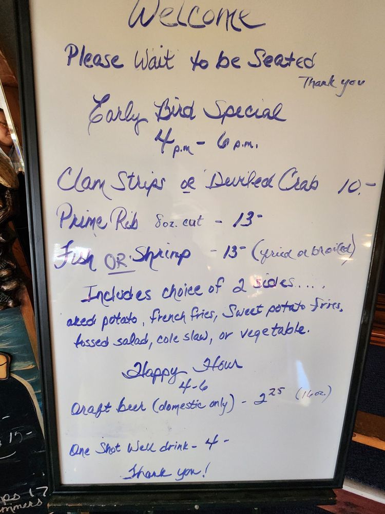 “ First time here absolutely loved it! I had small end cut prime rib and hubby had captains platter Staff and clientele were down to earth! Sang a few songs from the juke box with the regulars Next time were gonna try out the gorgeous pool table! ”